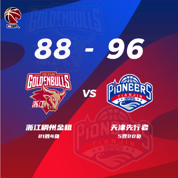 jrs直播网1月12日讯 CBA常规赛继续进行,领头羊浙江迎战天津,天津近期遭遇四连败后战绩来到4胜20负,目前仅列联赛倒数第三,浙江迎来连胜后战绩更新为21胜3负,继续领跑全联盟。比赛一上来两队进攻稍显滞涩,中段浙江率先找到进攻状态,内外结合的他们逐渐占据上风,首节结束时浙江暂时领先9分,次节回来,天津外线手感滚烫连中三分,双方分差逐渐被缩小,吴前连续突破得手率队稳住局势,半场战罢,浙江依然保有6分优势。易边再战后场上形势风云突变,浙江进攻断电单节仅得到14分,天津延续追分势头,中段一波9-0实现反超,末段浙江进攻依然滞涩,三节结束后天津反超5分,末节上来,浙江找回手感接连追分,无奈天津总能给予回应,决胜时刻双方陷入缠斗,杰弗森飚中冷血三分,浙江追分未果,最终天津96-88力克浙江。