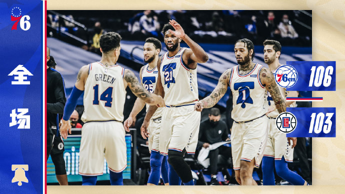 jrs直播网4月17日讯 今日NBA常规赛,快船客场挑战76人,本场比赛乔治复出,莱昂纳德继续缺战。比赛开始,76人迅速找到进攻节奏,三分线外神准,一波15-0进攻高潮取得大比分领先,快船慢慢找到进攻感觉,但首节结束仍然落后76人11分。次节开始后,快船进攻效率依然不高,虽然一度将分差缩小至5分,但很快就被76人再次拉开差距,半场战罢,76人59-47依然保持12分领先。下半场开始后快船外线开始发力,连续命中3记三分将分差缩小至只剩3分,乔治延续上半场火热状态里突外投接连拿分,恩比德依靠内线优势替76人稳住局面,三节结束,76人只领先快船4分。最后一节,快船持续发力依靠外线火热手感将比分反超,76人依靠恩比德内线优势不断造成杀伤,雷吉最后时刻关键三分将分差缩小至1分,格林依靠罚球取分稳住局面,最终76人力克快船终结其7连胜。