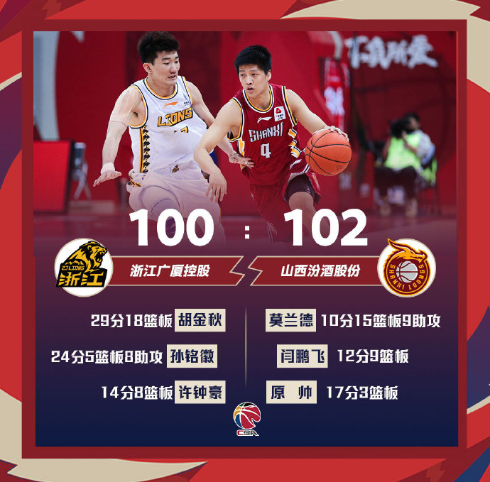 山西(19-33):葛昭宝21分2篮板3助攻,张宁17分2篮板2助攻,原帅17分3篮板,莫兰德10分15篮板9助攻3封盖,闫鹏飞12分9篮板,周湛东5分2篮板4助攻,张旭8分,席益民9分6助攻2抢断,陈彭宇迪3分4助攻