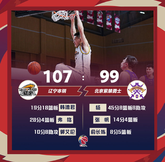 辽宁(44-9):弗格28分、韩德君19分18板、丛明晨14分、张镇麟12分7板、吴昌泽11分、郭艾伦10分8助、梅奥10分
