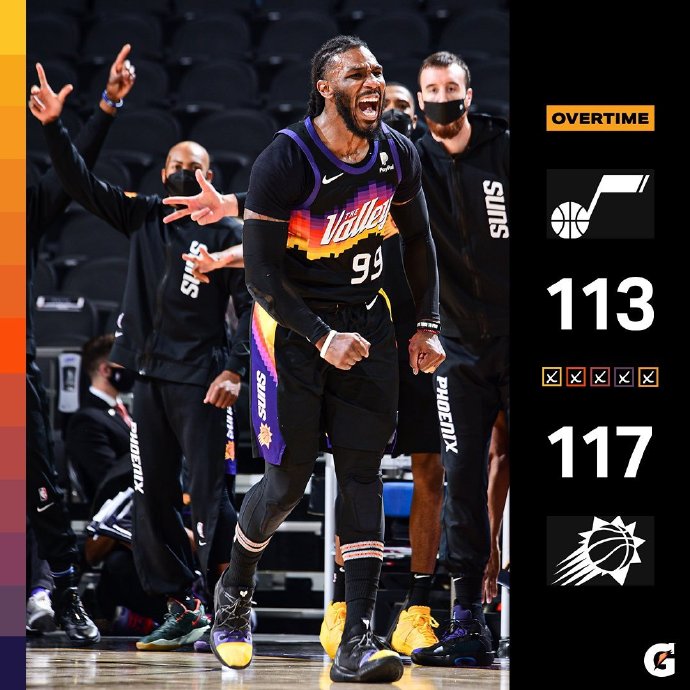太阳(36-14):布克35分4板3助,保罗29分4板9助,艾顿18分12板,克劳德6分12板,卡梅隆-约翰逊11分8板,克雷格7分5板,萨里奇6分8板,佩恩5分3板。