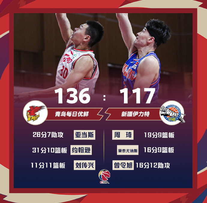 青岛(29-22):达卡里-约翰逊31分10篮板4助攻2抢断,亚当斯26分2篮板7助攻,刘传兴11分11篮板,王庆明9分5篮板4助攻,赵泰隆9分,赵大鹏17分4助攻,林韦翰4分5助攻2抢断,洪仲桦8分2篮板2助攻2抢断,张骋宇10分