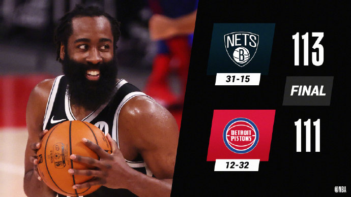 jrs直播网3月27日讯 今日NBA常规赛,篮网客场挑战活塞。篮网目前30胜15负排名东部第3,活塞则12胜31负排名东部垫底。比赛开始,活塞率先发力取得5分领先,篮网逐渐找到进攻状态将比分反超,首节结束,篮网领先活塞7分。次节开始,斯图尔特肘击格里芬遭驱逐,哈登连续得分将分差逐步扩大,半场战罢,篮网59-50领先9分。易边再战,活塞外线手感恢复,抓住篮网失误一度将比分反超,但哈登最后时刻发力连得5分,篮网82-78领先4分结束第三节。末节初段,篮网下起三分雨,将比分优势迅速扩大至12分,活塞外线逐渐找到手感,一度将比分扳平,关键时刻,杰夫-格林命中关键三分,哈登6犯离场,随着活塞最后一攻不中,最终篮网113-111险胜活塞。