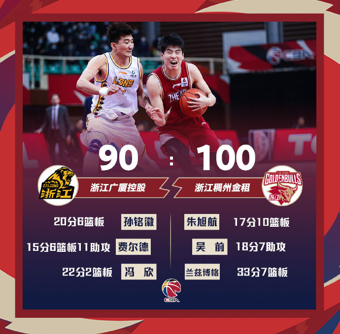 浙江(36-8):兰兹博格33分7篮板、吴前18分7助攻3篮板、朱旭航17分10篮板6抢断2盖帽、拉科塞维奇9分6篮板5助攻3抢断2盖帽、张大宇7分9篮板2盖帽、王奕博6分、程帅澎4分3篮板2助攻、陆文博3分4篮板2抢断、刘泽一3分2篮板