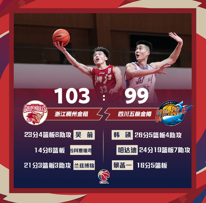 jrs直播网3月18日讯 CBA常规赛继续进行,浙江主场迎战四川。本赛季在吴前的带领下,浙江表现令人眼前一亮,目前高居联赛第三,球队也是取得了一波七连胜。四川本赛季表现尚可,目前排在联赛第八,球队中韩硕、哈达迪等老将仍发挥着重要作用。一开场,四川反客为主先声夺人,坚持冲击内线拿分,景菡一独得10分,韩硕也有9分进账,浙江手感不佳,首节三分线外10投2中,四川领先10分进入第二节。次节比赛,吴前连得10分帮助球队缩小分差,本节后半段浙江火力全开再送一波9-0,半场结束时浙江49-48反超1分。易边再战,双方打得难解难分,四川的双外援并未展现优势,兰兹伯格最后时刻连续得分帮助浙江领先4分结束第三节。末节两队争夺十分激烈,比分始终紧咬,最后时刻吴前关键抢断助攻兰兹伯格打成2+1后再次抢断反击上篮杀死比赛,最终浙江险胜四川获得八连胜。