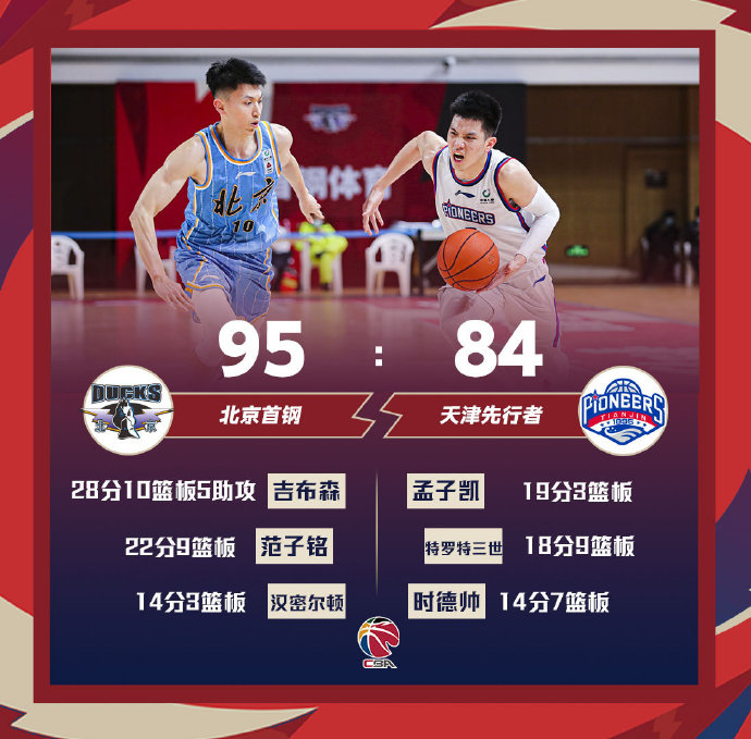 北京(22-20):吉布森28分10篮板5助攻2断,范子铭22分9篮板2助攻3断,汉密尔顿14分3篮板2断2帽,王骁辉7分5篮板2助攻2断,朱彦西6分2帽,刘晓宇6分9助攻4篮板,方硕4分4篮板4助攻1断,雷蒙5篮板4助攻,常林4分3篮板,李慕豪2分4篮板,麦克雷2分。