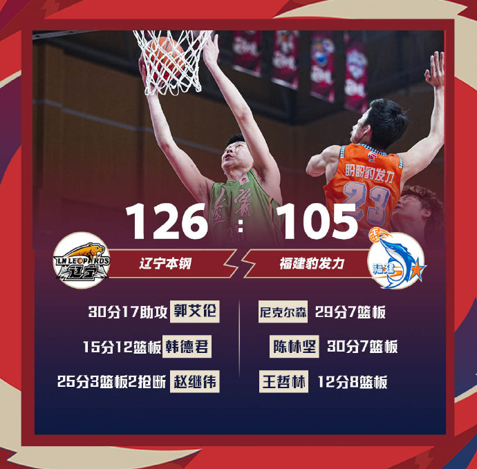 辽宁(36-8):郭艾伦30分17助、张镇麟20分、赵继伟25分、韩德君15分12板、梅奥12分、付豪12分6板