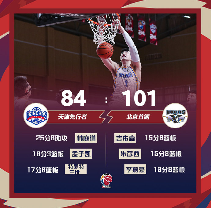 北京(16-19):朱彦西15分8篮板2助攻、吉布森15分8篮板3助攻2抢断、李慕豪13分8篮板、刘晓宇10分8助攻5篮板、方硕10分5助攻3篮板2抢断、汉密尔顿9分9篮板、周仪翔9分、范子铭8分5篮板2盖帽、王骁辉5分3篮板、张才仁4分3篮板、常林3分