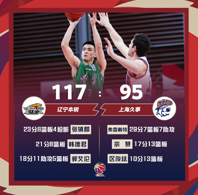 jrs直播网1月31日讯 CBA常规赛今日继续进行,排名第一并手握十连胜的辽宁对阵四连败的上海,首节比赛实力更胜一筹的辽宁便掌握场上局势,取得两位数领先,上海则是依靠弗雷戴特苦苦追分,首节结束,辽宁29-18领先上海。次节再战,辽宁扩大领先,分差一度来到18分,而在弗雷戴特带领下,上海将分差缩小,半场战罢,辽宁57-44领先上海。易边再战,本节接近中段时,郭艾伦与梅奥联手打出一波11-0将领先扩大到20分,随后辽宁保持20分左右优势,以88-67领先上海进入最后一节。最终决战中,上海年轻球员发挥出色,在本节中段将分差缩小到12分,换回主力后,辽宁稳住局势再度取得20分以上优势,上海无力追赶比分,最终全场比赛结束,辽宁117-95轻取上海取11连胜同时送给对手5连败。