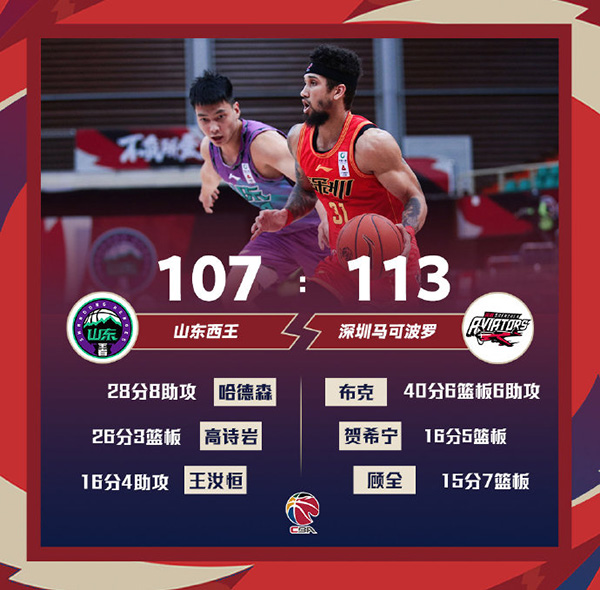 jrs直播网1月17日讯 CBA常规赛第31轮迎来最后较量,上轮力克青岛的山东迎战两连败的深圳,首节一上来深圳外线率先开张,单节命中5记三分的他们,首节结束时已经取得10分领先,次节回来后山东进攻手感回暖,两队外线火热对飚,半场战罢,深圳继续领先11分。易边再战后山东轰出17-5攻击波反超比分,末段深圳回敬一波13-1小高潮,三节结束后深圳依然领先11分,末节决战,高诗岩联手哈德森不断追分,关键时刻布克和贺希宁先后取分,最终深圳113-107力克山东。