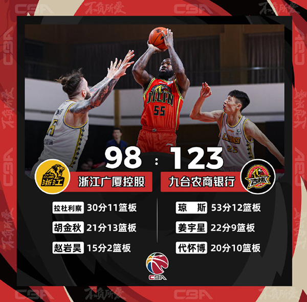 广厦(9-13):拉杜利察30分11板2助、胡金秋21分13板、赵岩昊15分2板2助2断、冯欣12分3助2断、赵嘉仁9分3助、杜金伦3分2断、纪卓3分、李京龙1分2板2助