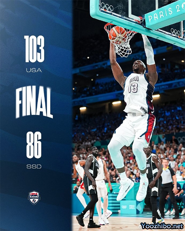 jrs直播网讯 北京时间8月1日讯 奥运男篮小组赛C组,美国对阵南苏丹。比赛开始,双方开场短暂相持,随后美国男篮加强防守利用反击打出18-4的进攻高潮一举获得两位数优势,阿德巴约内线翻江倒海,哈利伯顿连中三分帮助球队将分差拉开到20分,南苏丹里突外投拿分苦苦支撑,半场战罢美国男篮55-36领先19分。易边再战,库里助飞塔图姆,但南苏丹三分4连击缩小分差,怀特和爱德华兹相继命中三分稳住局势,末节浓眉出现违体犯规,南苏丹趁势连拿5分,美国男篮多点开花打出10-2的小高潮将分差拉开到20分以上,南苏丹大势已去。最终,美国男篮103-86击败南苏丹。