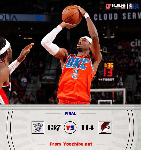 jrs直播网11月2日讯 NBA常规赛激战正酣,雷霆和开拓者两支西部球队正面交锋,雷霆开赛至今4连胜强势领跑西部,开拓者上场力克快船,目前2胜3负位列西部第12位。比赛开打后迅速呈现一边倒,亚历山大和杰伦-威廉姆斯联手取分,雷霆连续打出得分高潮,首节结束时雷霆已经领先13分,次节回来,场上形势风云突变,开拓者找到节奏单节狂轰44分,多点开花的他们不断缩小分差,半场战罢,两队战成66平。易边再战后雷霆找回状态,亚历山大予取予求连投带传带动全队,开拓者进攻再度停滞单节仅得到17分,雷霆顺势将比分再次拉开,三节结束后雷霆确立21分优势,末节上来,开拓者进攻乏力追分无望,两队尽遣替补,比赛提前失去悬念,最终雷霆137-114大胜对手豪取开赛5连胜。
