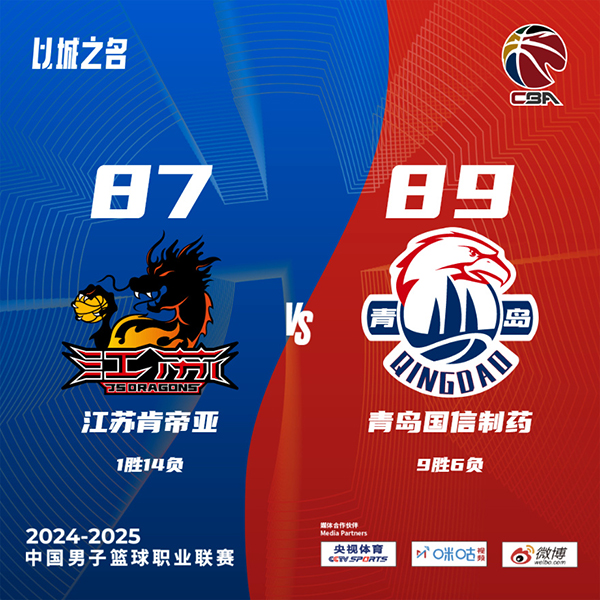 jrs直播网讯北京时间12月9日讯 CBA常规赛,江苏主场迎战青岛,江苏目前1胜13负排在积分榜第19位,青岛则是8胜6负排名第10,本场比赛青岛外援鲍威尔不打。比赛开始,双方上来十分慢热,随后韦瑟斯庞接连外线发炮连续取分为青岛开局,杰克逊接连杀伤回应,米奇内外线也能得分,青岛首节领先6分,次节青岛连续失误,进攻端也陷入停滞,江苏则是连续前场篮板拿到二次进攻机会,马国栋顺下暴扣助江苏半场反超2分。下半场,江苏一波8-0直接拉开双位数领先,随后江苏突然断电,青岛回应15-1反超比分,双方犯满后又接连犯规罚球,三节江苏领先4分,末节青岛连续三分不中,江苏再次扩大领先,随后双方展开拉锯战,江苏始终保持微弱领先,比赛进入白热化,双方都有关键失误,韦瑟斯庞中投绝杀,最终青岛89-87险胜江苏。