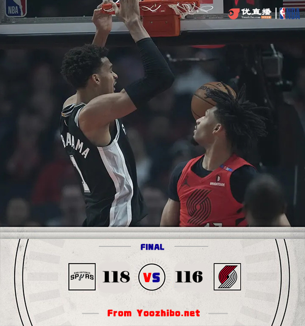jrs直播网讯北京时间12月14日讯 NBA常规赛,开拓者主场迎战马刺,开拓者4连败后8胜16负排在西部第13位,马刺则是12胜12负排名西部第11,本场比赛艾顿和罗威都缺阵。比赛开始,开拓者上来打出12-5开局,随后开拓者突然断电,文班亚马攻防建功带队轰出17-3攻击波一举反超比分,保罗接连抱怨裁判连吃2T被驱逐,首节马刺领先8分,次节双方命中率都有下降,场上连续打铁,打了半节多都未得分上双,文班上场再次连续得分带队半场领先10分。下半场,格兰特连续3记三分一度助开拓者抹平分差,随后格兰特继续发力再扔进3记三分,单节轰下22分带队轰出46分直接反超8分,末节马刺连续失误,西蒙斯连续扔进三分带领开拓者一度领先到17分,但尚帕尼接连三分,马刺全民皆兵强势回应24-4进攻波反超比分,比赛进入白热化,文班亚马被格兰特犯规两罚领先,阿夫迪亚绝杀三分不中,最终马刺118-116险胜开拓者,送对手5连败。