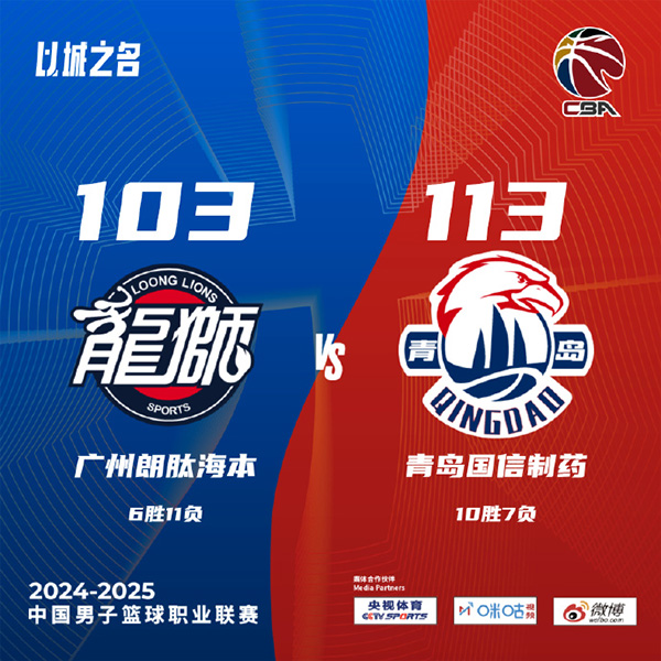 jrs直播网讯 2024年12月14日讯 CBA常规赛,广州主场迎战青岛,广州目前6胜10负排在第15位,青岛则是9胜7负排名第10,本场比赛郭艾伦继续缺阵,丁彦雨航还未体测。比赛开始,杨瀚森攻防两端发力,赵嘉义也接连三分命中,青岛顺势取得领先,但广州双外援联手回应咬住比分,韦瑟斯庞里突外投连砍9分,首节青岛领先5分,次节米奇和韦瑟斯庞协同发力拉开双位数领先,随后青岛下起三分雨一度领先到近20分,但广州半场结束前接连3记三分回应追到差9分。下半场,双方展开拉锯战,广州依靠外援追分,韦瑟斯庞连续3记不讲理超远三分强势回应,三节青岛继续领先10分,末节双方还是外援互相对飚,分差始终保持在10分左右,韦瑟斯庞总能在关键时刻站出来回应,最终青岛113-103力克广州。