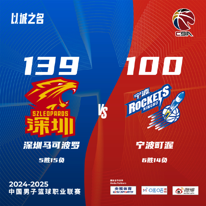 jrs直播网讯12月20日讯 CBA常规赛,深圳对阵宁波,深圳上场比赛惜败上海,宁波最近遭遇4连败。开场后汤普森在内线表现强势,宁波先发外线手感不错连连命中三分,周鹏替补登场后首节独得10分帮助深圳扩大优势。第二节汤普森在内线依旧予取予求,马凯尔-约翰逊和威姆斯也开始发挥,深圳连连打出攻势将分差拉大到20分,宁波也主要依靠外援追分。易边再战,汤普森上来依旧状态火热连连远投命中,宁波虽然没能缩小分差,但也没有让分差继续被拉大。不过第四节深圳全面开花单节再度打爆宁波,场上分差一路被拉大,最终深圳139-100大胜宁波,宁波遭遇5连败。