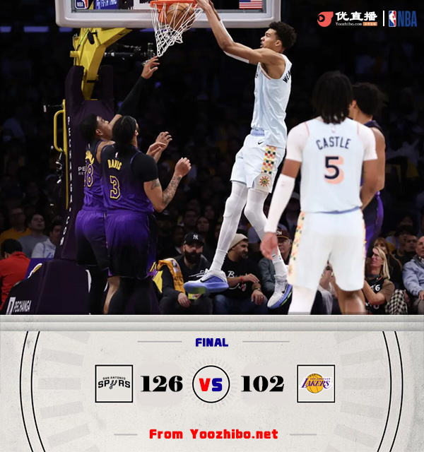 jrs直播网讯北京时间1月14日讯 NBA今日继续开打,湖人今日坐镇主场迎战马刺。湖人此前因为洛杉矶大火的原因两个主场延期首节之争马刺开局2分半里一分未得导致被动开局,湖人则在里夫斯的连续拿分中取得7-0的开局;不过随着比赛深入马刺渐入佳境,文班亚马和瓦塞尔联手抢分帮助马刺后来居上反超比分;次节双方对攻大半节的时间,不过湖人更胜一筹在末段送出8-0的攻势拉开两位数分差并奠定半场9分领先。休息归来马刺迅速做出回应,凯尔登第三节的压哨三分让双方重新回到同一起跑线;末节决胜马刺彻底接管比赛,马刺在文班亚马并没有太大发挥的情况下仍然轰出20-7的攻势直接拉开两位数分差奠定胜局。最终,马刺客场掀翻湖人,并送湖人3连败。