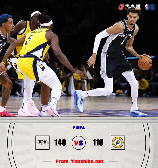 jrs直播网讯 北京时间1月24日讯 NBA常规赛巴黎赛,马刺对阵步行者。马刺19胜22负西部第12,步行者24胜19负东部第5。一开场,双方大打对攻,比分交替领先,文班亚马里突外投高效输出,步行者多点开花给出回应,次节两队继续缠斗,步行者率先发力占据主动,马刺奋力反击夺回优势,半场战罢马刺60-57领先步行者。下半场,文班攻防两端发力,马刺持续输出单节狂轰45分,一举确立20分以上优势,末节马刺稳扎稳打保持大比分的领先,步行者换下主力投子认负。最终,马刺140-110大胜步行者。