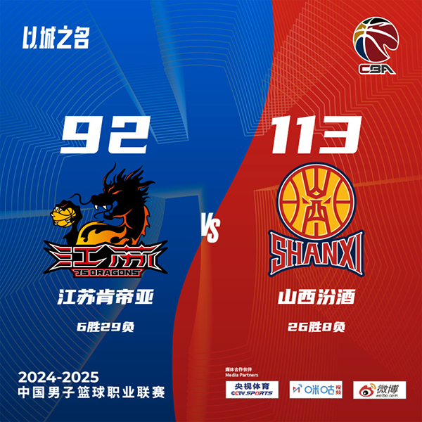 jrs直播网讯 北京时间1月25日讯 CBA常规赛,江苏对阵山西,江苏上场比赛击败天津结束6连败,山西上场比赛被同曦终结连胜势头。开场后刘传兴多次打内线得手,江苏靠着两名外援的发挥后来居上,两队经过一段混战后,山西队的古德温连续冲击内线追平比分。两队首节都犯规颇多,第二节上来山西依旧多次强攻篮下拿分,贾明儒外线手感火热接连三分命中将领先优势扩大,江苏队靠着外援的发挥努力追分,但全面开花的山西在半场结束时依旧手握15分优势。易边再战,汤普森面对刘传兴多次在中距离投篮命中,不过山西进攻发挥稳定始终保持两位数优势,张宁内突外投接连拿分。最后一节张宁延续状态频频杀入内线帮助山西将分差拉大到20分以上,比赛失去悬念,最终山西113-92轻松击败江苏。