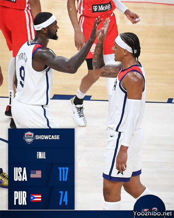 jrs直播网8月8日讯 男篮世界杯开战在即,热身赛美国男篮对阵波多黎各男篮,美国男篮12人大名单分别为哈特、莺歌、波蒂斯、JJJ、布伦森、布里奇斯、C-约翰逊、哈利伯顿、爱德华兹、里夫斯、班凯罗和凯斯勒。比赛开始,波多黎各男篮打得很主动,美国男篮慢热之后接连攻击内线一波8-2小高潮反超比分,里夫斯上来连续中远投拿到5分拉开比分,沃特斯站出来帮助波多黎各追到差6分。次节波多黎各接连扔进三分一度追平比分,但美国男篮依靠身体优势,接连打出反击暴扣还是能保持住领先优势,半场美国男篮领先7分。下半场,双方展开拉锯战,美国男篮依靠自己的突破和断球反击重新保持双位数领先,爱德华兹里突外投连拿9分,美国男篮一波10-0在三节结束时领先至23分。末节,美国男篮上来又一波10-0直接拉开30分以上的领先,随后美国男篮越打越轻松拉开40分以上的分差,最终美国男篮117-74大胜波多黎各。