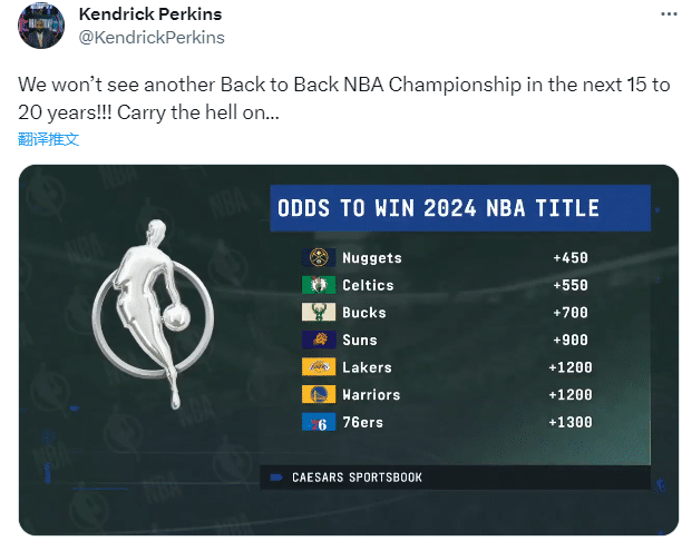 1、掘金+450;2、凯尔特人+550;3;雄鹿+700;4、太阳+900;5、湖人和勇士并列+1200;7、76人+1300