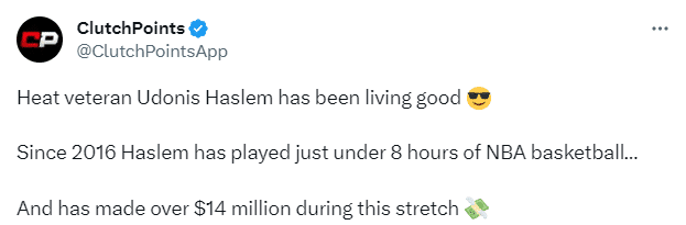 最近几年,哈斯勒姆一直为热火效力,但他上场的时间并不多,20-21赛季仅仅只打了3分钟,21-22赛季出战83分钟,22-23赛季出战71分钟;据统计,最近7年哈斯勒姆总共出战不到8小时却狂赚1400万美元,相当于每小时挣到175万美元。