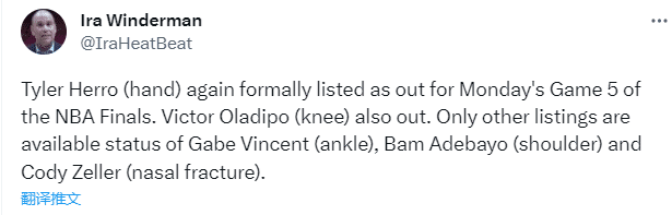 来源:jrs直播网06-12 10:52jrs直播网06月12日,热火官方公布总决赛G5伤情,希罗(手部骨折)和奥拉迪波(膝伤)都因伤缺席生死战,文森特(脚踝)、阿德巴约(肩膀)和泽勒(鼻骨骨折)都可以出战;预计掘金全队都可以出战,约基奇的脚踝伤势无大碍,穆雷(手掌擦伤)则继续带伤出战。