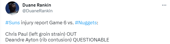 艾顿因肋骨挫伤出战成疑,今年季后赛至今,艾顿场均上场31.9分钟拿到13.4分9.7篮板1助攻,在西部半决赛中,艾顿彻底被约基奇打爆。
