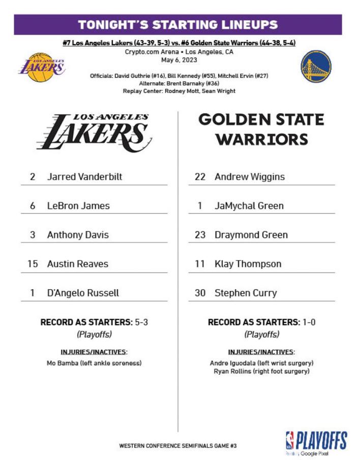 科尔拒绝提前透露首发,直到赛前半个小时,勇士按照规定公布首发,G3首发阵容是库里、汤普森、格林、维金斯和J-格林。