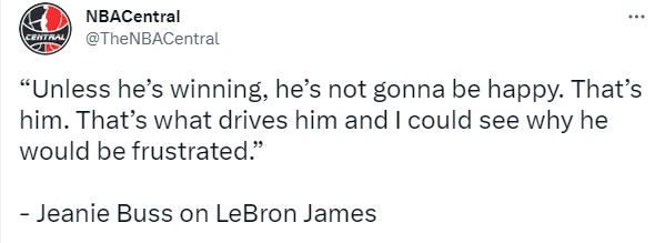 湖人输球并且遭遇连败,38岁的詹姆斯自然不开心,不久前,湖人美女老板珍妮-巴斯在节目中谈到詹姆斯是否比上赛季更开心的话题,珍妮-巴斯表示:除非他赢球,否则他不会开心,这就是他,这就是他的动力所在。我知道他为什么这么沮丧,我们一度伤了四个首发,而他一个人抗下了所有,是他激励了大家。