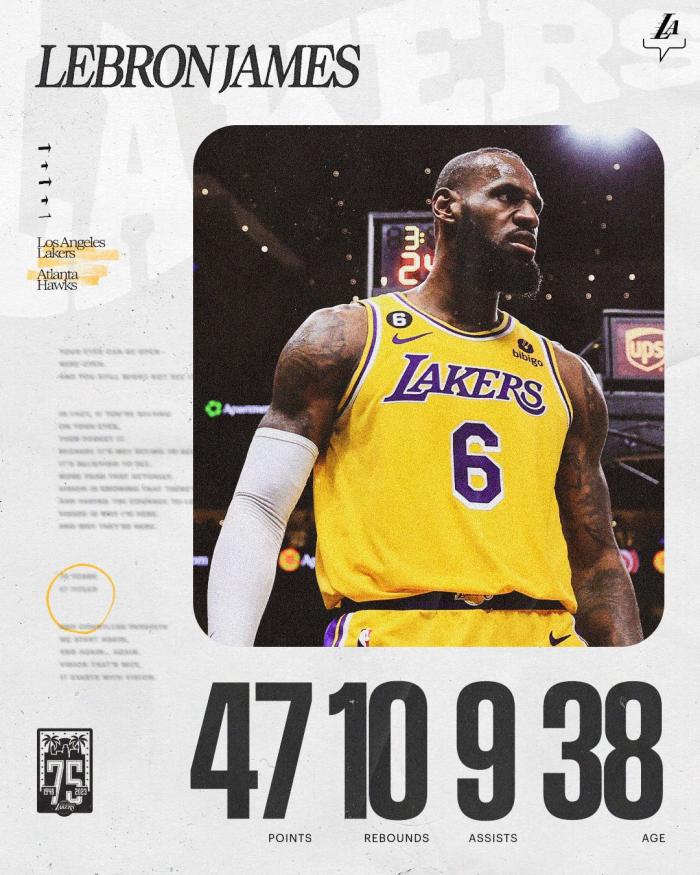 詹姆斯在38岁生日夜带队赢球并且狂刷纪录——得分创赛季新高,生日夜单场得分第三高,38岁后单场47分排在历史第三位,仅次于贾马尔-克劳福德和乔丹(38岁后曾单场轰51分;成为乔丹之后第二位38岁或以上年龄轰下45+10的球员。