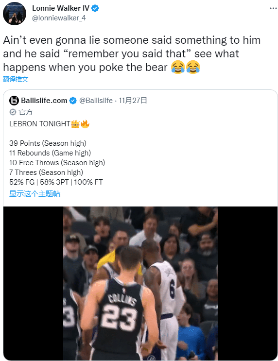 沃克还透露詹姆斯上一场大爆发投进7记三分轰下39分11篮板的原因,他转发老詹集锦并且发推写道:我甚至不想撒谎,有个人对他说了某些话,然后他说,‘请记住你那么说了。’看看吧,当你摸老虎屁股后会发生什么。