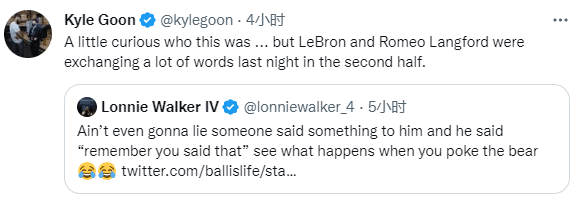 湖人记者猜测是兰福德激怒了老詹,KyleGoon转发并写道:“我有点好奇这个人是谁……但昨晚勒布朗和罗密欧-兰福德在下半场进行了大量的斗嘴。