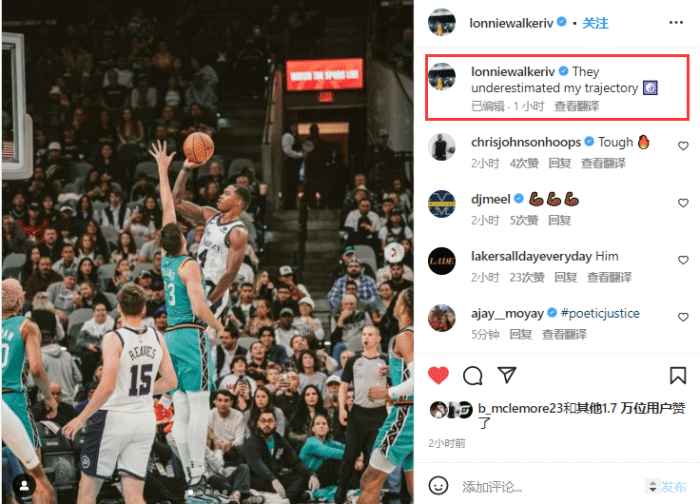 朗尼-沃克不满旧主放弃他吗?今年休赛期,本来朗尼-沃克是受限制自由球员,马刺撤回对他的资质报价,之后沃克和湖人签下1年650万美元的合同。