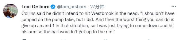 赛后科林斯回应肘击威少事件,他表示:我并没有想打威少的头部,当时我被威少的假动作晃起来了,在那种情况下,最坏的结果就是被他打成2+1,所以,我只是想打到威少的手臂,不让他把球打进;不幸的是,我的肘部正好碰到了他的头,他开始流血,看起来很糟糕,但老实说,我什么都没做。我只是不想让他出手。