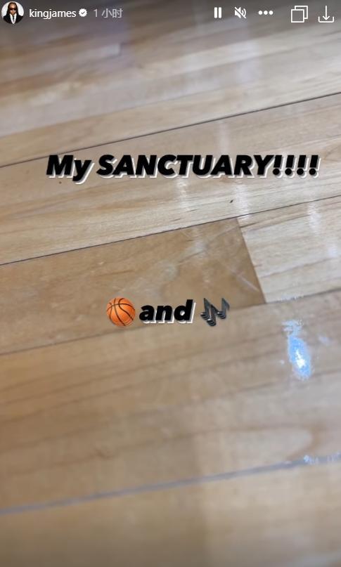 詹姆斯在Ins上更新动态,老詹正在挥汗苦练,配文写道:篮球和音乐是我的避难所;詹姆斯还晒出训练服被汗湿透了。