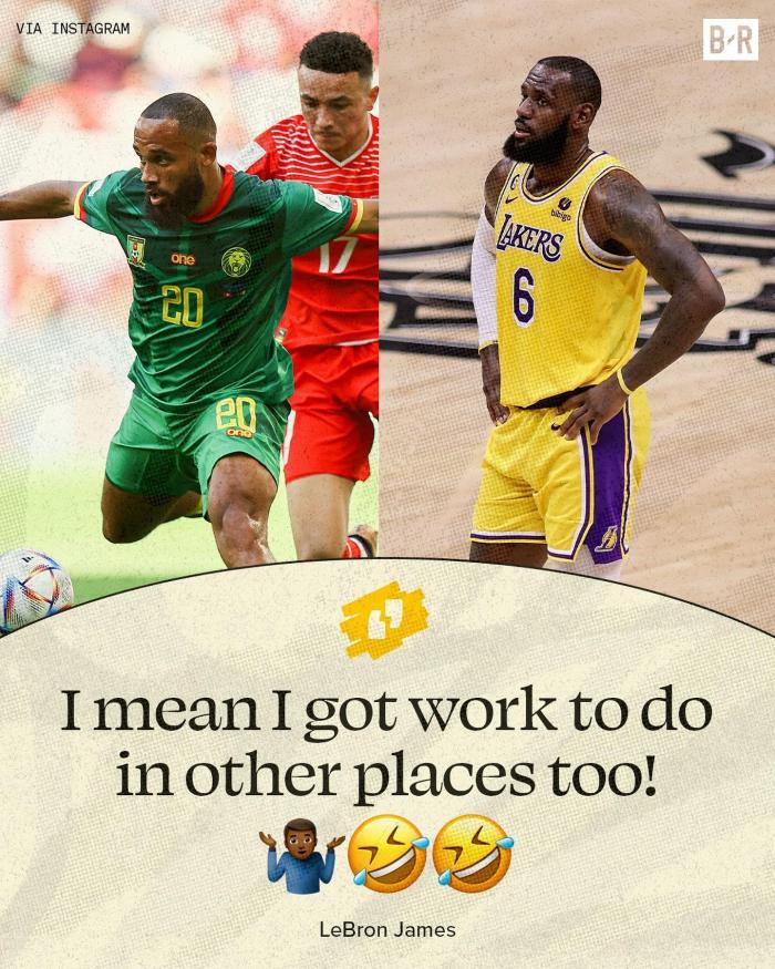 今天詹姆斯与世界杯联系在一起引热议,湖人自媒体晒出喀麦隆20号球员姆贝乌莫参加世界杯的赛场照,并且配文写道:这就是勒布朗缺席最近5场比赛的原因,找到了你的双胞胎兄弟。