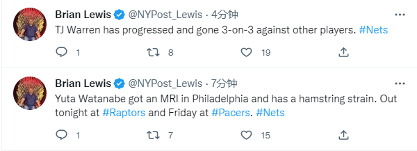 来源:jrs直播网11-24 16:01jrs直播网11月24日,篮网队的最新伤情曝光,据篮网记者Brain lewis报道,渡边雄太的核磁检查结果显示,他的腿筋拉伤,因伤至少再缺席2场比赛;篮网新援TJ-沃伦已经参加三对三比赛,