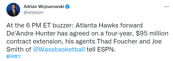 2019届新秀迎来续约狂潮,未来5年,亨特继续为老鹰效力,继续联手特雷-杨冲击总冠军,最后再次恭喜亨特!