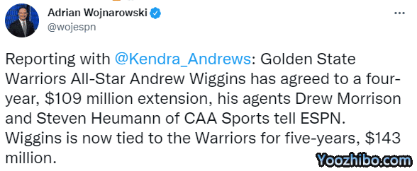 普尔续约后维金斯也续约,维金斯和勇士新签4年1.09亿美元大合同,勇士随队记者AnthonySlanter跟进报道维金斯的合同细节,维金斯拥有球员选项,新合同第一年薪水是2430万美元、第二年薪水是2630万美元;维金斯22-23赛季的工资为3360美元,加上新合同,未来5年他的合同总额是1.43亿美元。