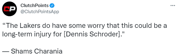 湖人后卫施罗德手指受伤无法出战与国王的比赛,名记shams表示不确定施罗德能否赶上下周的常规赛;湖人将进一步评估施罗德伤势,他们确实有些担心这可能对施罗德造成长期伤害。