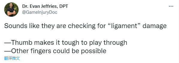 对于施罗德的伤病,医学专家Evan Jeffries担忧施罗德的拇指韧带损伤,发推写道:听起来像他们正在检查施罗德的拇指韧带损伤,拇指受伤很难参加比赛,其他手指受伤的话,也许可以继续参加比赛。