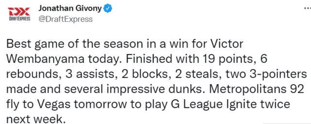 来源:jrs直播网10-01 11:30jrs直播网10月01日讯 ,在最新结束的一场法甲比赛中,文班亚马出战32分钟,得到19分6篮板3助攻2盖帽2抢断,帮助球队92-82获胜。选秀专家Givony评价道:“这是文班亚马本赛季至今打得最好的一场比赛。他投进了两个三分球,还有一些令人印象深刻的扣篮。”文班亚马明日将随队飞往拉斯维加斯,下周他将和G联赛的点燃队交锋两次,PK另一位状元热门亨德森。