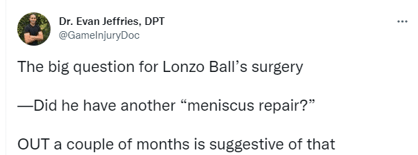 对于鲍尔的伤情,医学专家Evan Jeffiries表示,郎佐-鲍尔手术的大问题是他是不是又进行了一次“半月板修复”? 缺席数月暗示了这一点。