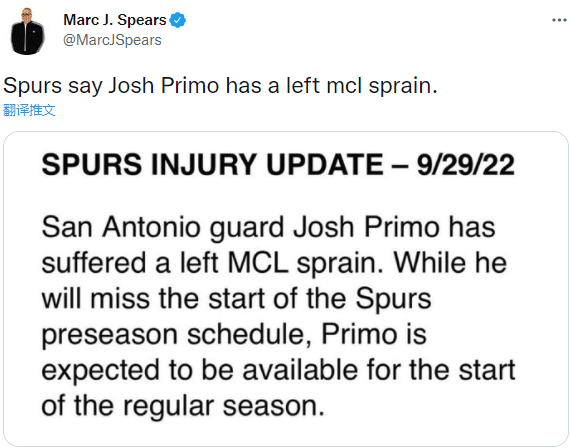 此前马刺曾宣布新星凯尔登-约翰逊在训练中遭遇右肩脱臼,同样预计常规赛初期复出;约翰逊本人也表示他的肩伤不严重,今夏他和马刺达成4年7400万美元的续约合同。