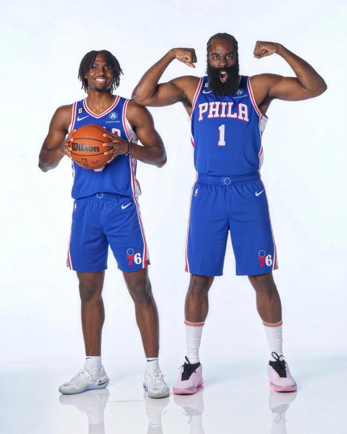 76人官方晒五虎合影:新星C位哈登大笑 恩比德靠边站一脸不开心