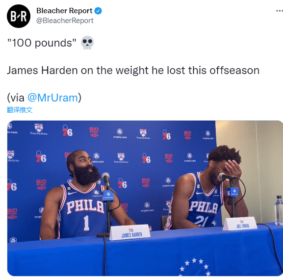 接受采访时,哈登一本正经地开玩笑,他说:我在今年夏天减轻了100磅(约45公斤)的体重,你们去发推特吧;坐在一旁的恩比德捂着头笑。