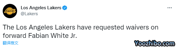 今年7月25日,湖人与小法比安-怀特签下一份Exhibit 10合同;两个月之后,小法比安-怀特被湖人裁掉。