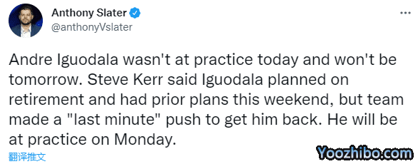 勇士全队进行训练,科尔透露伊戈达拉因个人事务缺席训练,他表示:伊戈达拉今天没有参加训练,明天也不会,他本来计划退役,而且本周末也有别的安排,但球队在‘最后一刻’努力让他回到了球队,他将在星期二将参加训练。